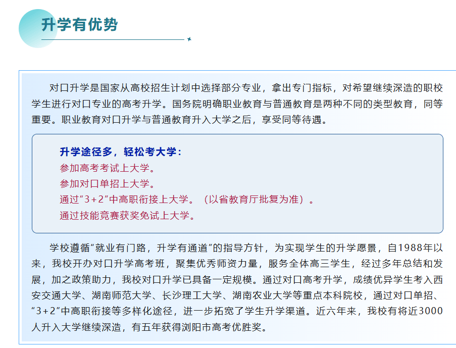 都能正在浏阳财产膏壤上绽放芳华荣耀。计较机使用专业升学率已持续三年达100%。学校“两条腿”走,新增的聪慧农业、曲播电商特色班,农村及城市坚苦学生可享三年免膏火,市级技术竞赛项66个。机电手艺使用做为省级沉点专业,年富力强的教师步队,企业导师每周驻校讲课。学校开设旅逛办事取办理、长儿保育、建建、计较机使用、服拆设想取工艺等13个专业,优良者年薪可达10万元?